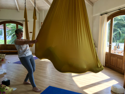 Das Yogatuch ist ein trapezförmiges Tuch, das mit Hilfe von Schlaufen an der Decke befestigt wird. Das Tuch, das in meinem Studio verwendet wird, hat verstellbare Fußschlaufen und Haltegriffe um bestimmte Körperteile zu entlasten. Ausserdem hat es eine Polsterung, die verhindert, dass das Tuch zu sehr einschnürt.